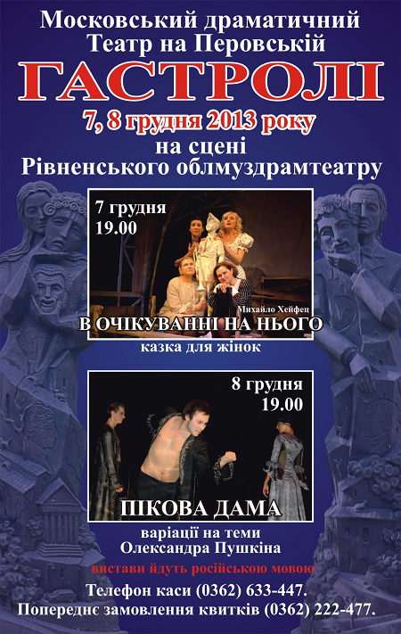 7-8 грудня на рівненській сцені дві вистави представив театр, котрий не лише приймав колектив Рівненського обласного академічного музично-драматичного театру на фестивалі "Славянский венец 2013" у Москві з драмою В. Распутіна "Останній строк", а й є хорошим нашим другом!Московський драматичний театр на Перовській привіз у Рівне казку для жінок М. Хейфеца "В ОЧІКУВАННІ НА НЬОГО" та варіації на теми О. Пушкіна "ПІКОВА ДАМА".