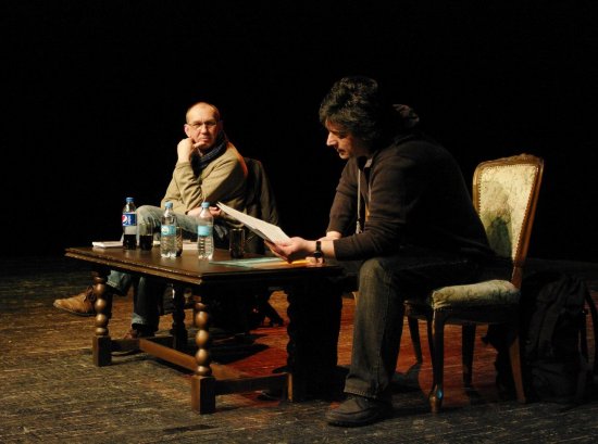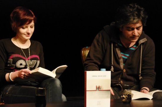 Після короткого представлення та огляду книжки, Олександр Бойченко разом із запрошеною з залу глядачкою Юлею прочитали частину п’єси “Пісочниця”.
