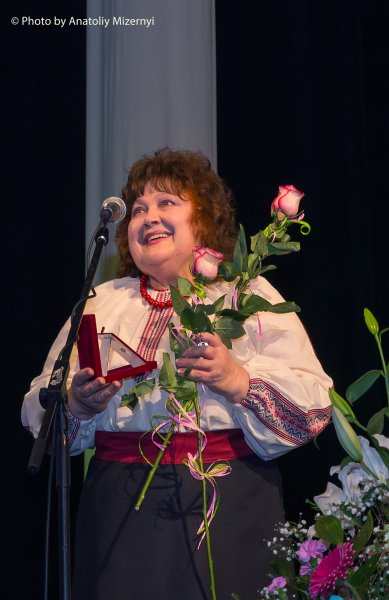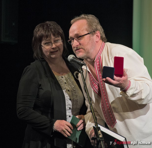 Традиційно для ювілею окремі працівники театру отримали різноманітні відзнаки та грамоти. А ось нагороду Рівненського облмуздрамтеатру «За відданість та багаторічне служіння театру» з рук директора-художнього керівника Володимира Петріва отримала народна артистка України Ліна Ізарова.