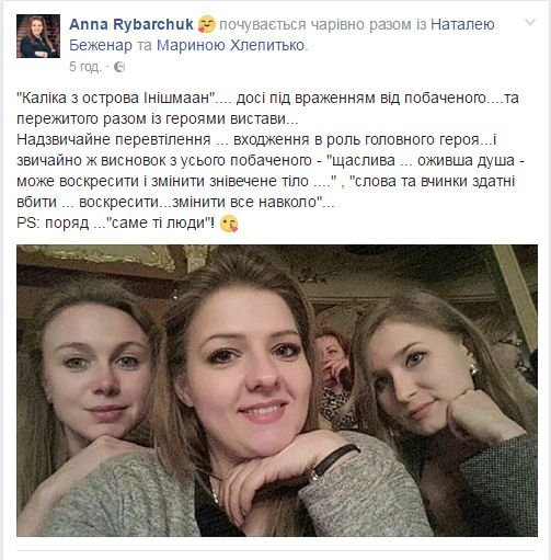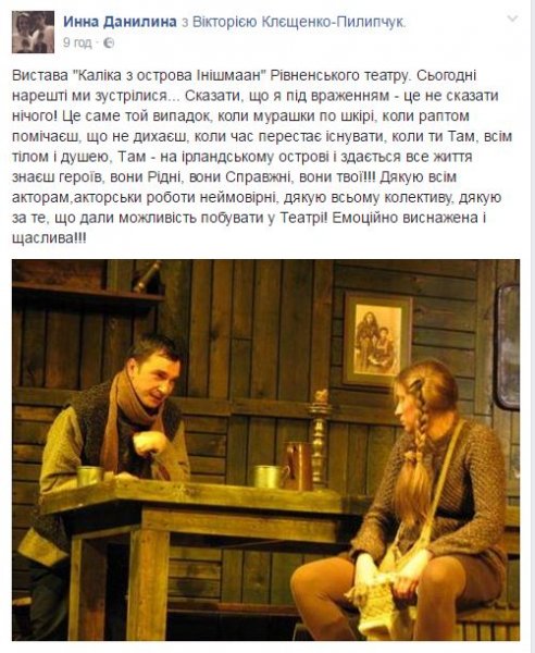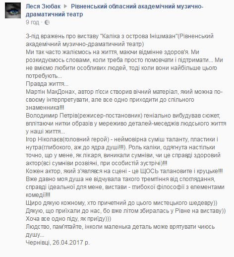 26 квітня на сцені Чернівецького обласного музично-драматичного театру ім. О. Кобилянської наш колектив показав виставу "Каліка з острова Інішмаан" М. Макдонаха. До цього міста з ірландською комедією нас запросили "на біс" після виступу на фестивалі "Золоті оплески Буковини - 2016", за що ми дуже вдячні господарям театру у Чернівцях! Дякуємо усім, хто прийшов, адже зал був переповнений, а оплески лунали посеред вистави й у тих місцях, де їх раніше не було. А що ж думають глядачі про наш показ? Переглянемо кілька відгуків?