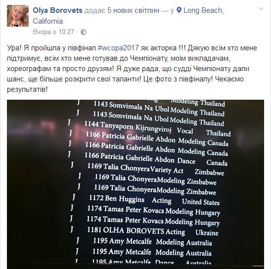 Саме на номінацію "акторська майстерність" Оля покладала найбільше надій і ось саме вона принесла дівчинці першу перемогу - вихід у півфінал! Про це конкурсантка повідомила на своїй сторінці у Facebook.