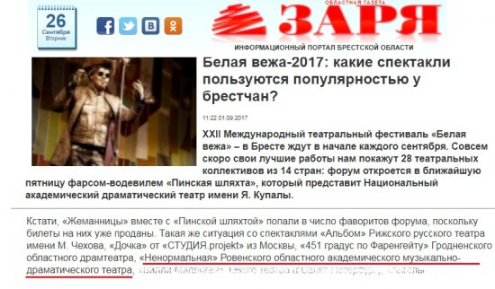 14 вересня в рамках фестивалю "Біла вежа" наш театр показав виставу також і у містечку Жабінка, що за 30 кілометрів від Бресту. Місцеві глядачі приймали рівнян оплесками, а в білоруській пресі з'явилась публікація про наш приїзд під заголоком Вполне нормальная «Ненормальная». До речі, це вперше учасник "Білої вежі" представив свою роботу на виїзді в під час фестивалю.