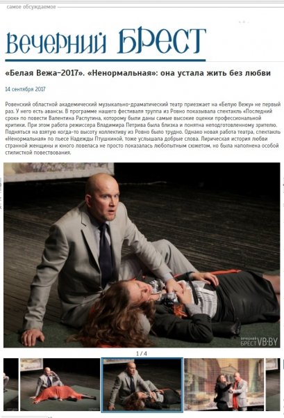 13 вересня на ХХІІ Міжнародному театральному фестивалі "Біла вежа" у м. Брест наш театр презентував історію кохання "Ненормальна" за твором Н. Птушкіної. Незмінному акторському дуету Вікторії Клєщенко-Пилипчук та В'ячеслава Давидюка довелось непросто.