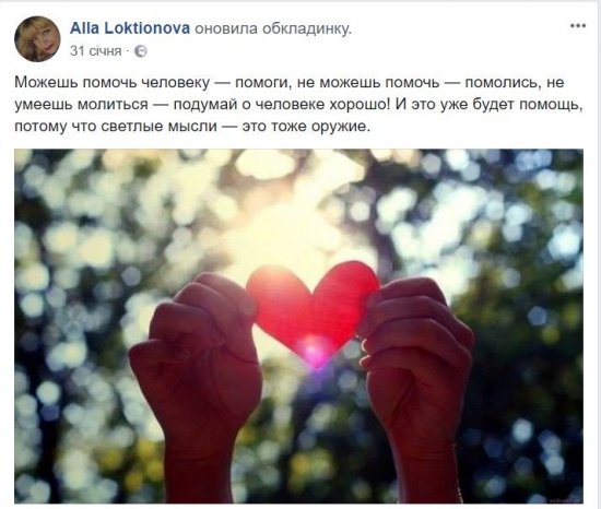 На сторінці у Facebook Алла Олегівна залишила прекрасні слова, рецепт того, як залишатись Людиною, як любити...
