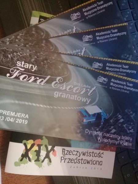 19 жовтня 2019 року колектив Рівненського облмуздрамтеатр побував у польському Забже, місті-партнері Рівного. Саме там у Новому Театрі з 12 по 20 жовтня проходив ХІХ Фестиваль сучасної драматургії «Представлена реальність». У конкурсній програмі фесту традиційно взяли участь театри Польщі. Фестиваль має статус загально польського тому рівняни виступили на забжанській сцені, як запрошений колектив. Презентували глядачам постепічну драму «Старий Форд Ескорт темно-синій» за п’єсою сучасного німецького драматурга Дірка Лауке. Режисером вистави є Юрій Паскар.