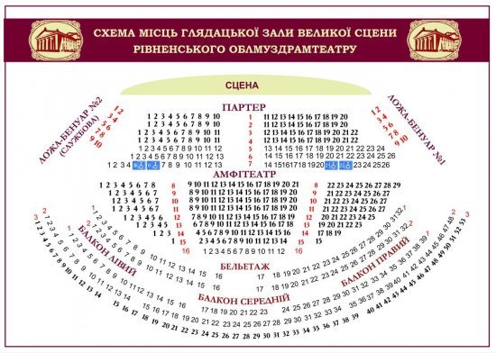 У глядацькій залі великої сцени передбачені місця для крісел колісних / 7 ряд, місця 5, 6, 21, 22/.