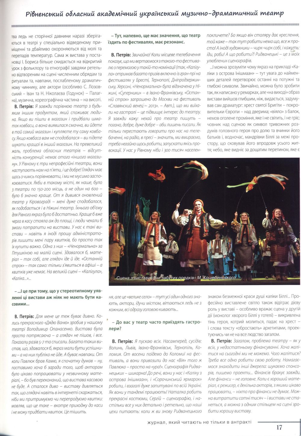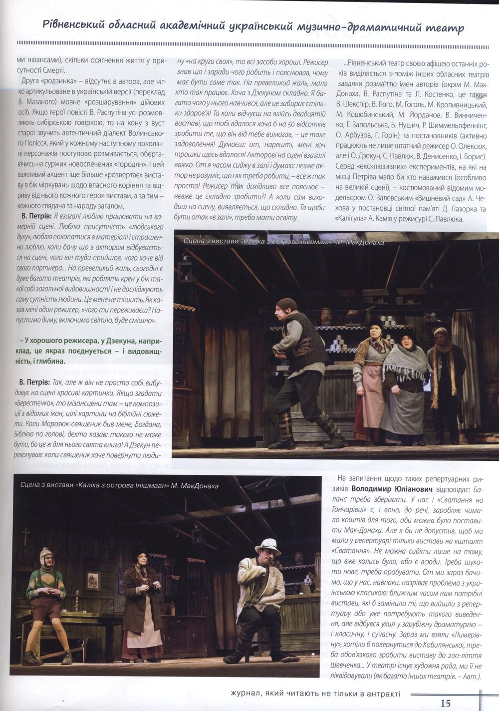 Рівненський театр своєю афішею останніх років виділяється з-поміж інших обласних театрів завдяки розмаїттю імен авторів (окрім М. Мак-Донаха, В. Распутіна та Л. Костенко, це також В. Шекспір, В. Гюго, М. Гоголь, М. Кропивницький, М. Коцюбинський, М. Йорданов, В. Винниченко, Г. Запольська, Б. Нушич, Р. Шиммельпфеннінг, О. Арбузов, Г. Горін) та постановників (активно працюють не лише штатний режисер О. Олексюк, але і О. Дзекун, С. Павлюк, В. Денисенко, І. Борис). Серед "ексклюзивних" експериментів, на які на місці Петріва мало би хто наважився - костюмований відомим модельєром О. Залевським "Вишневий сад" А. Чехова та "Калігула" А. Камю. " Не можна сидіти лише на тому, що вже колись було, або є всюди. Треба шукати нове, треба пробувати - вважає Володимир Юліанович. - Можна витратити сотні тисяч - і вистави не станеться, а можна з одним стільцем на сцені зробити хорошу виставу".