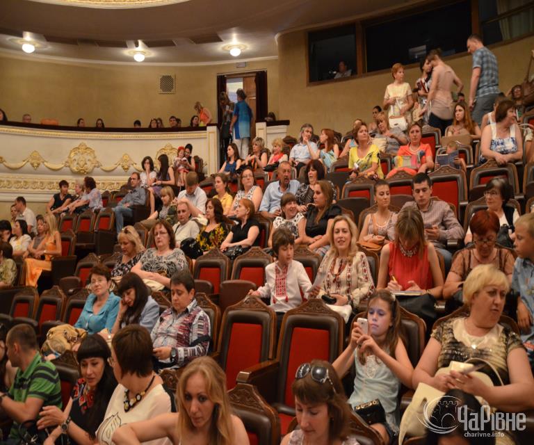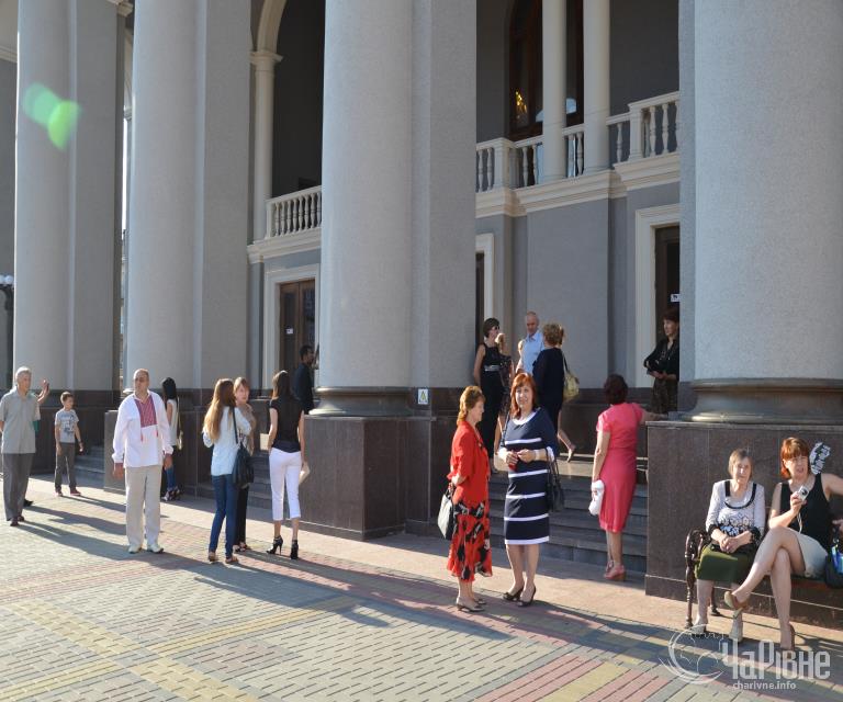 Перед входом драмтеатру та у глядацькій залі люди різного віку та професій. Приходять цілими родинами і навіть з ще зовсім маленькими дітьми.