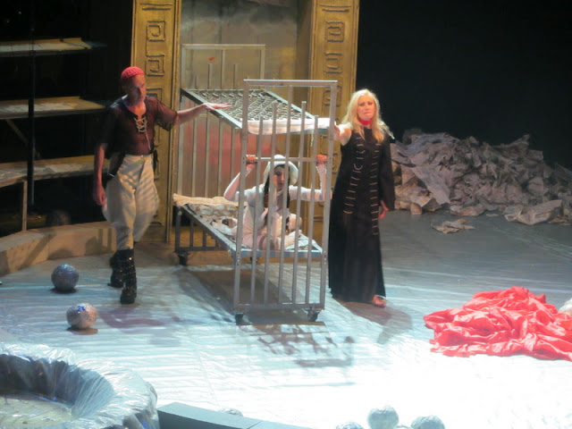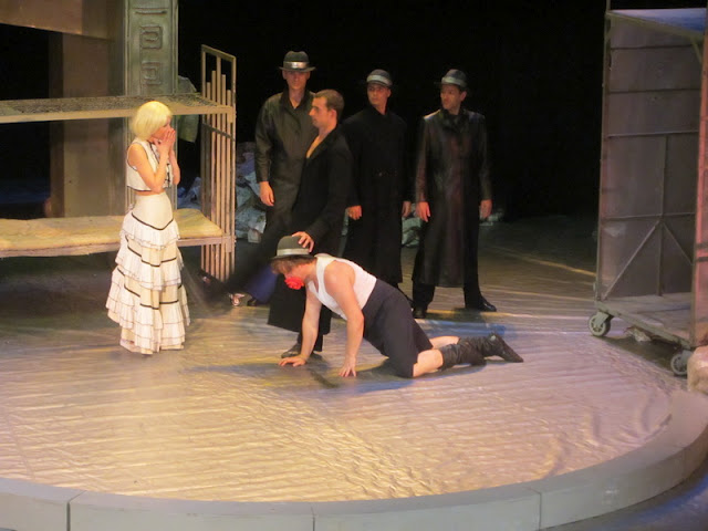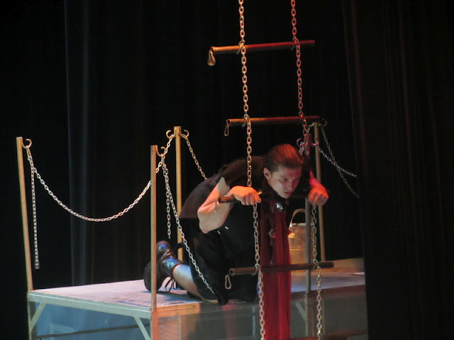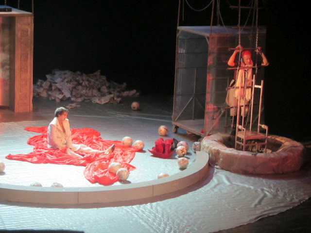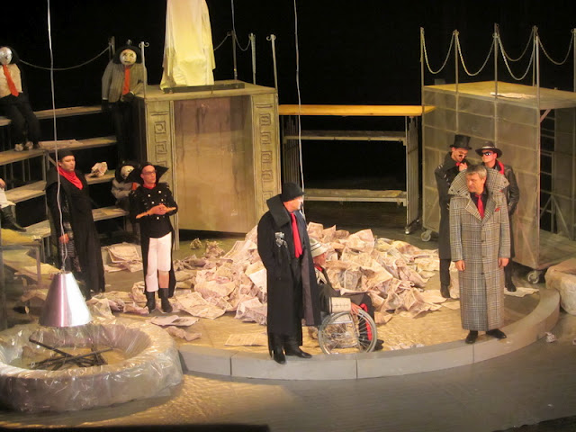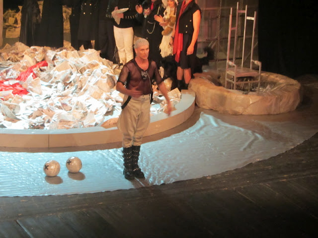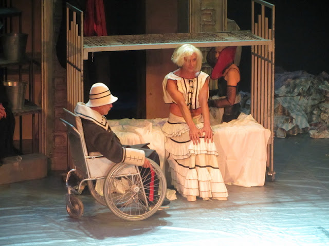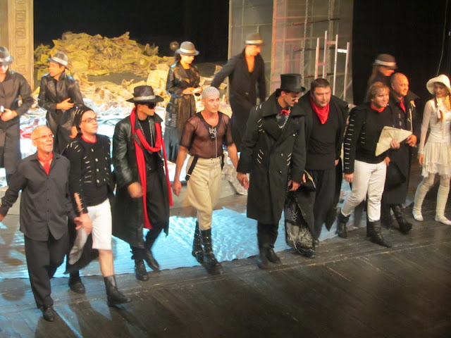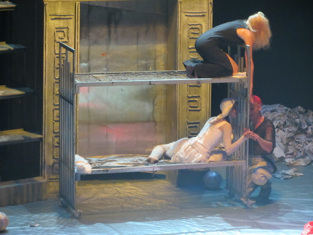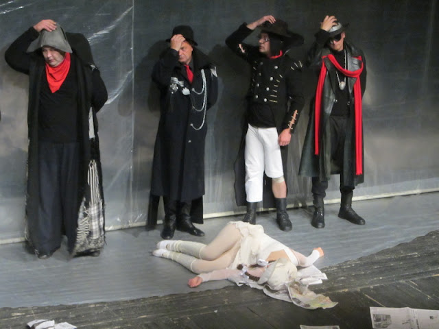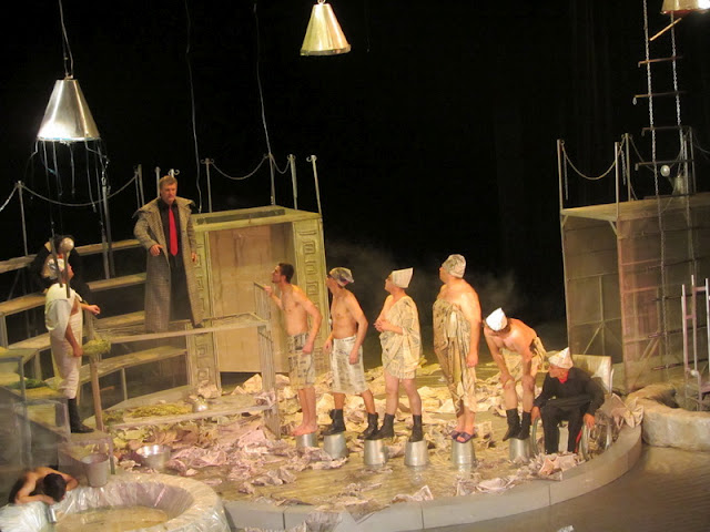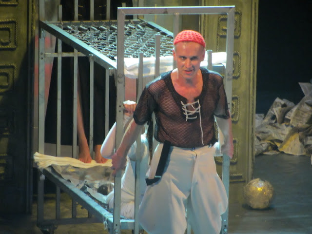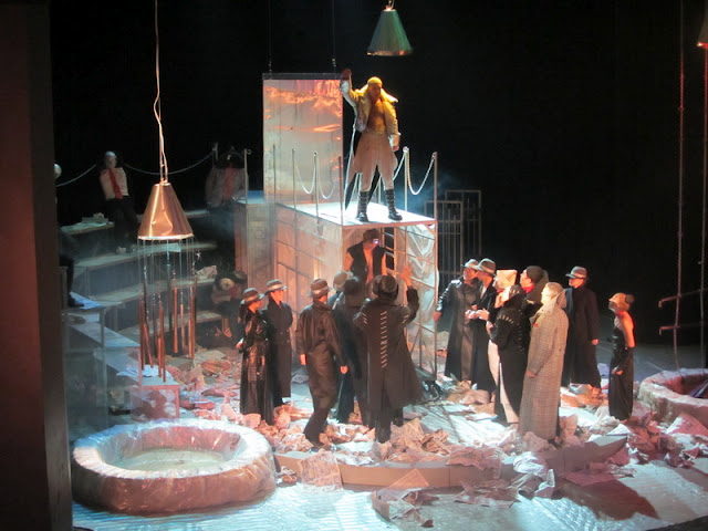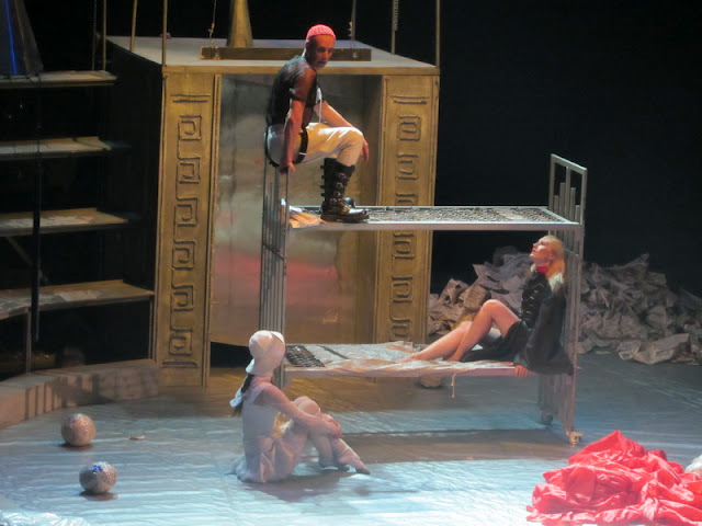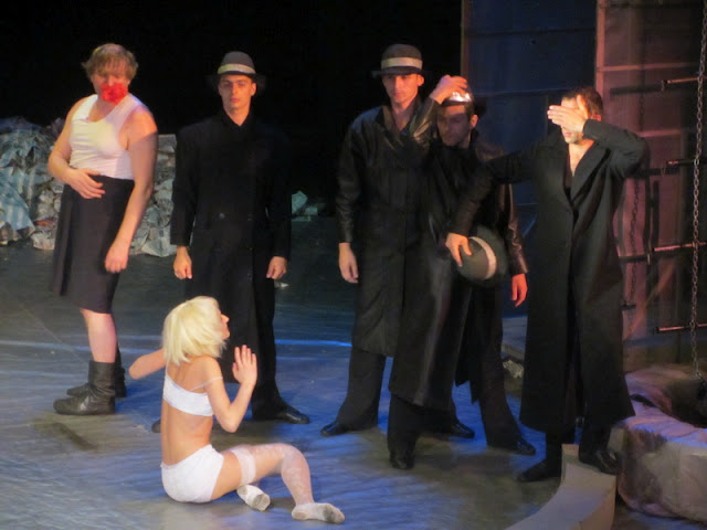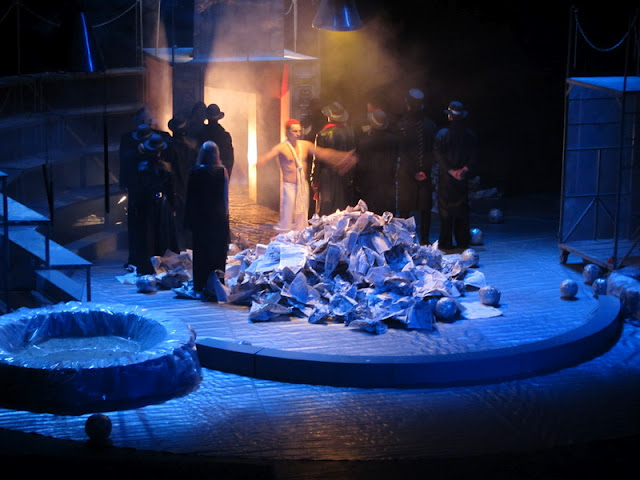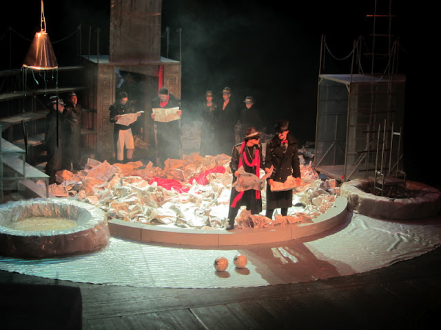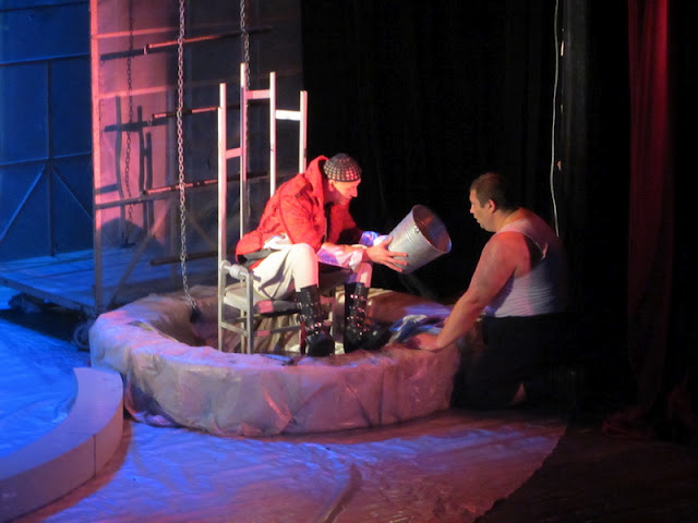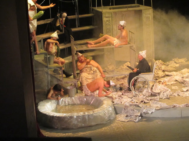 – Этот мир такой, как он есть, невыносим. Следовательно, мне нужна луна, или счастье, или бессмертие – что угодно, пусть даже безумие – но не от мира сего, – говорит Калигула со сцены и творит беспредел. Килограммы газетной макулатуры летят в воздух. Черный пес (настоящий!) лает на патрициев. Отрубленные головы катятся с гильотины (одна даже упала в первый ряд). Бассейны с водой, принимающие то купающихся, то жертв. Двухъярусная кровать в ожидании оргий, римская баня с полками и вениками. Ходули, цепи, лестницы, лампы, красное полотнище, гремящие ведра, переходящая из рук в руки дубленка, танец маленьких лебедей в газетной пачке и еще куча всяких разных деталей, над которыми зритель еще долго будет думать: почему? И, возможно, найдет ответ – для себя. Так как само содержание «экзистенции» по определению – индивидуально и неповторимо и означает переживания отдельно взятого индивида, не похожего ни на кого.
